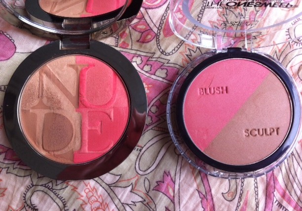 For some reason the blush side of L'Oréal is more true on the top picture. Not as bright as Dior, it still gives quite a nice effect on cheeks. The same goes for the sculpt part which to me works quite well as a bronzer. Very natural, it has just the right amount of shimmer but it is a little more orangy than Dior so I have to be careful and apply lightly.